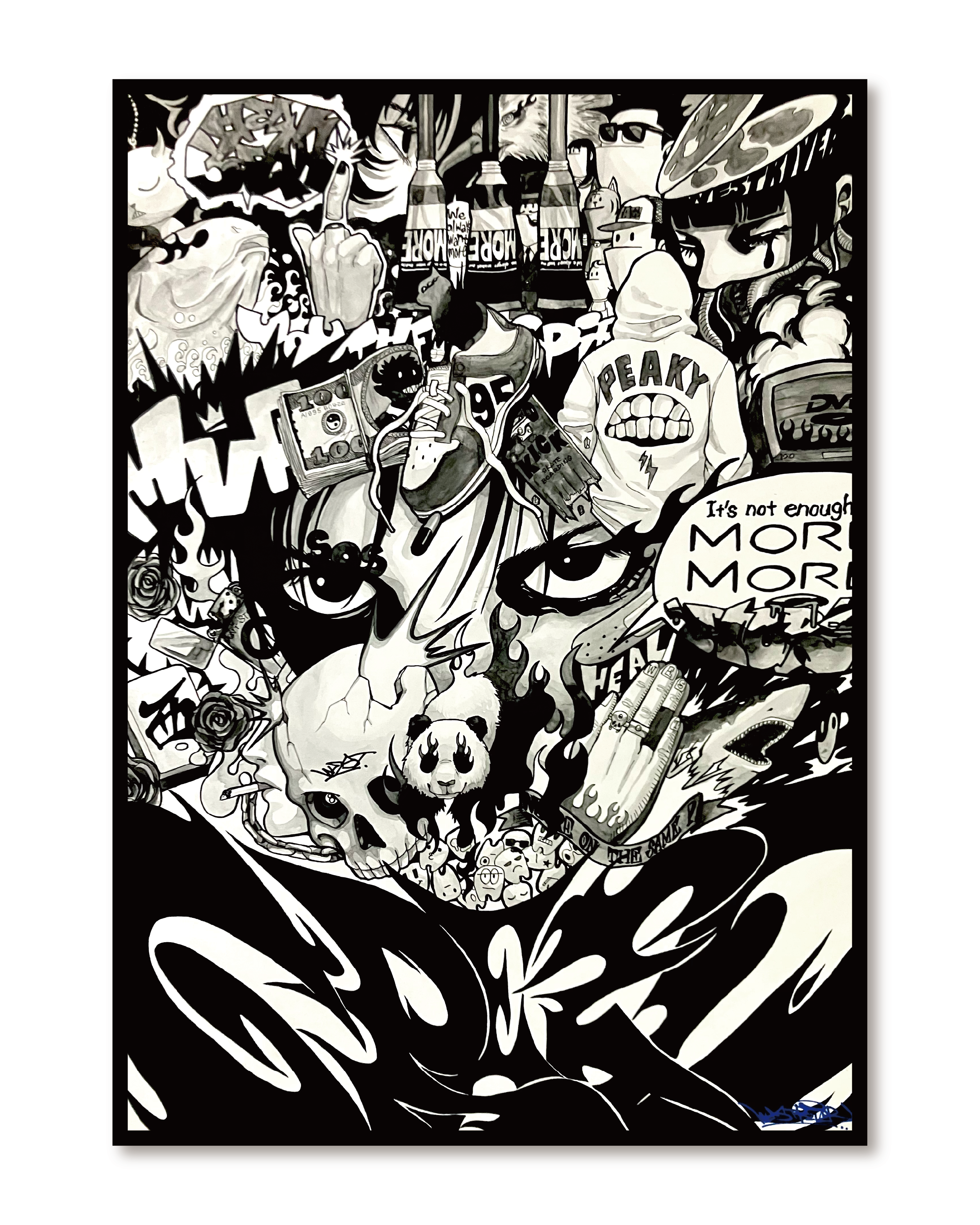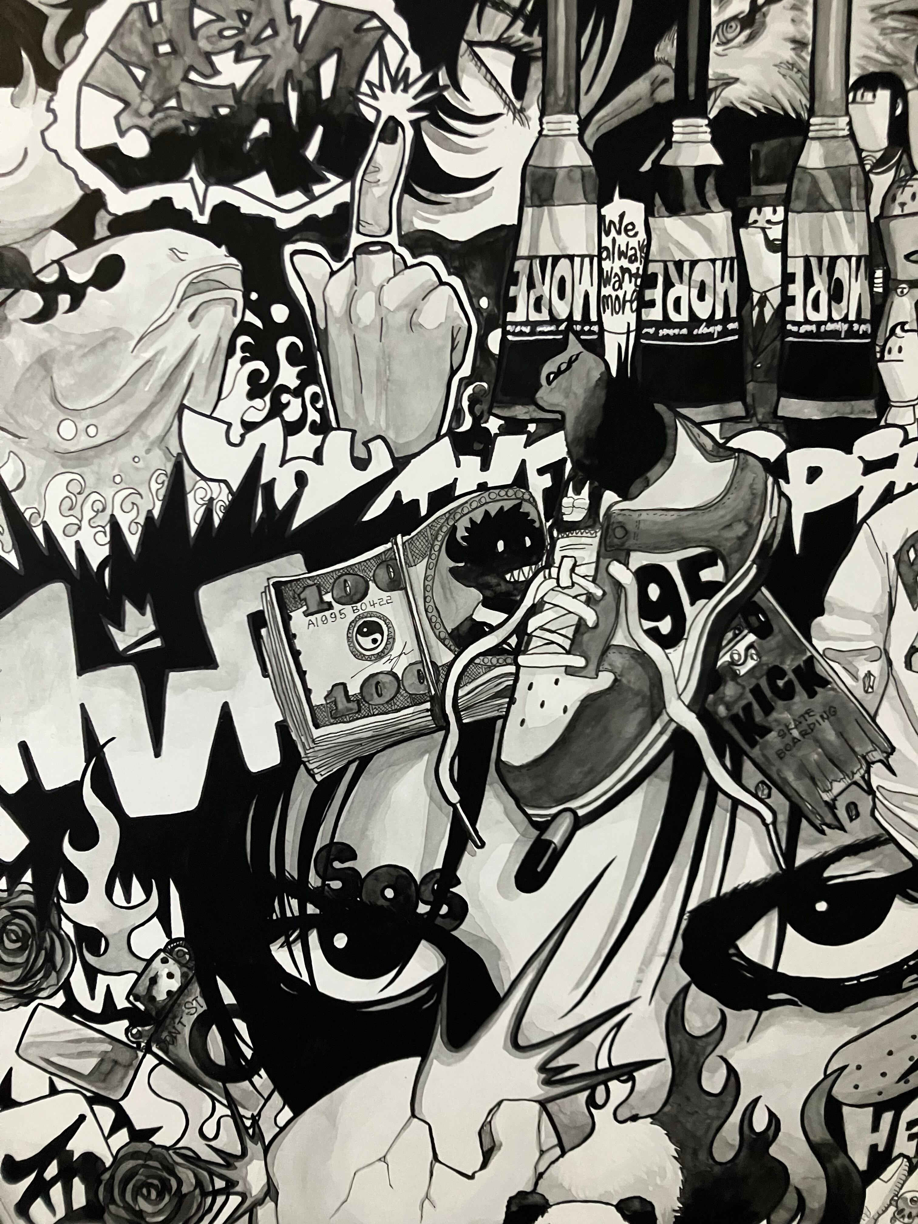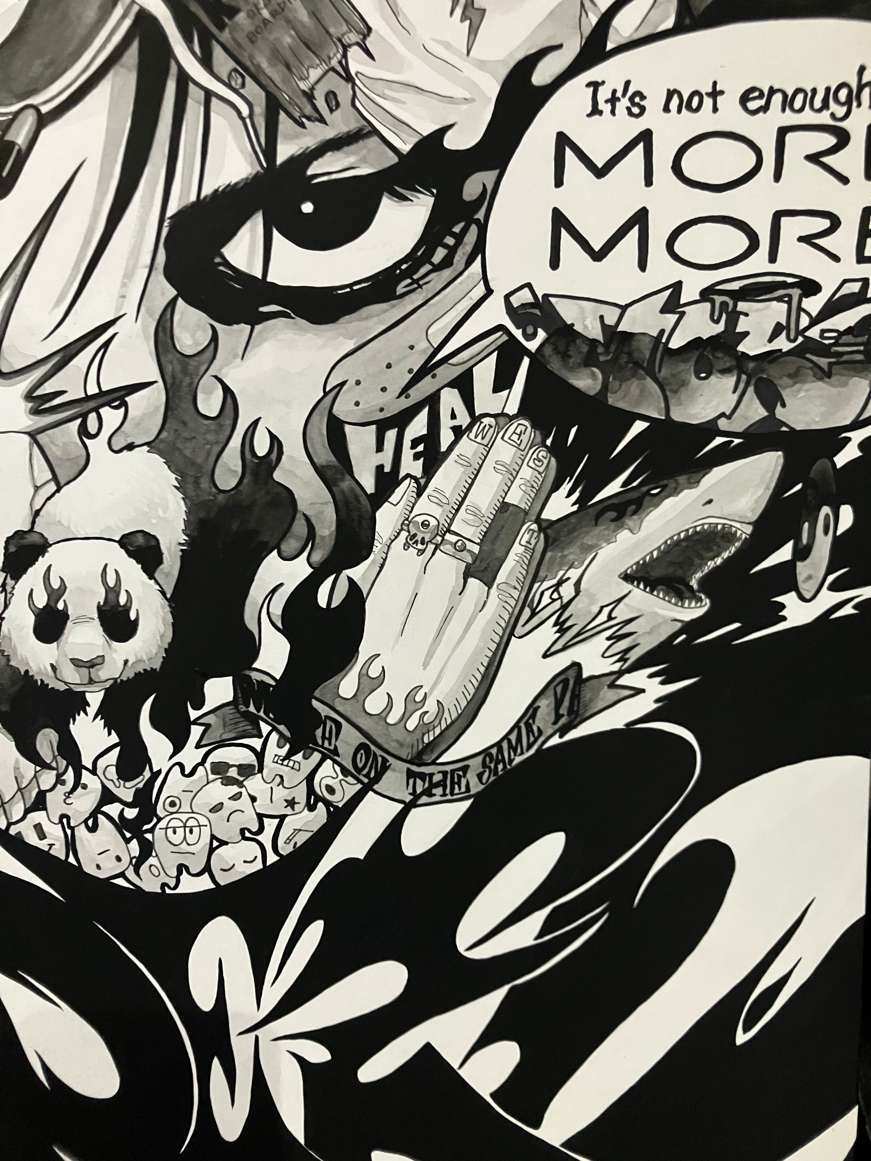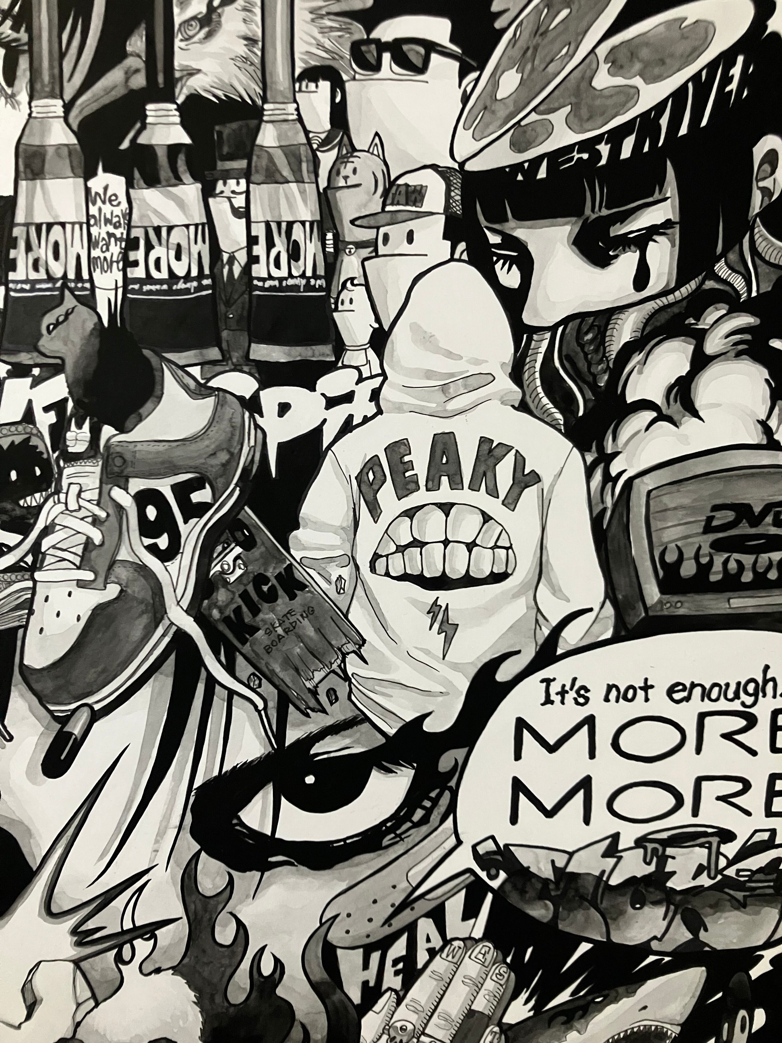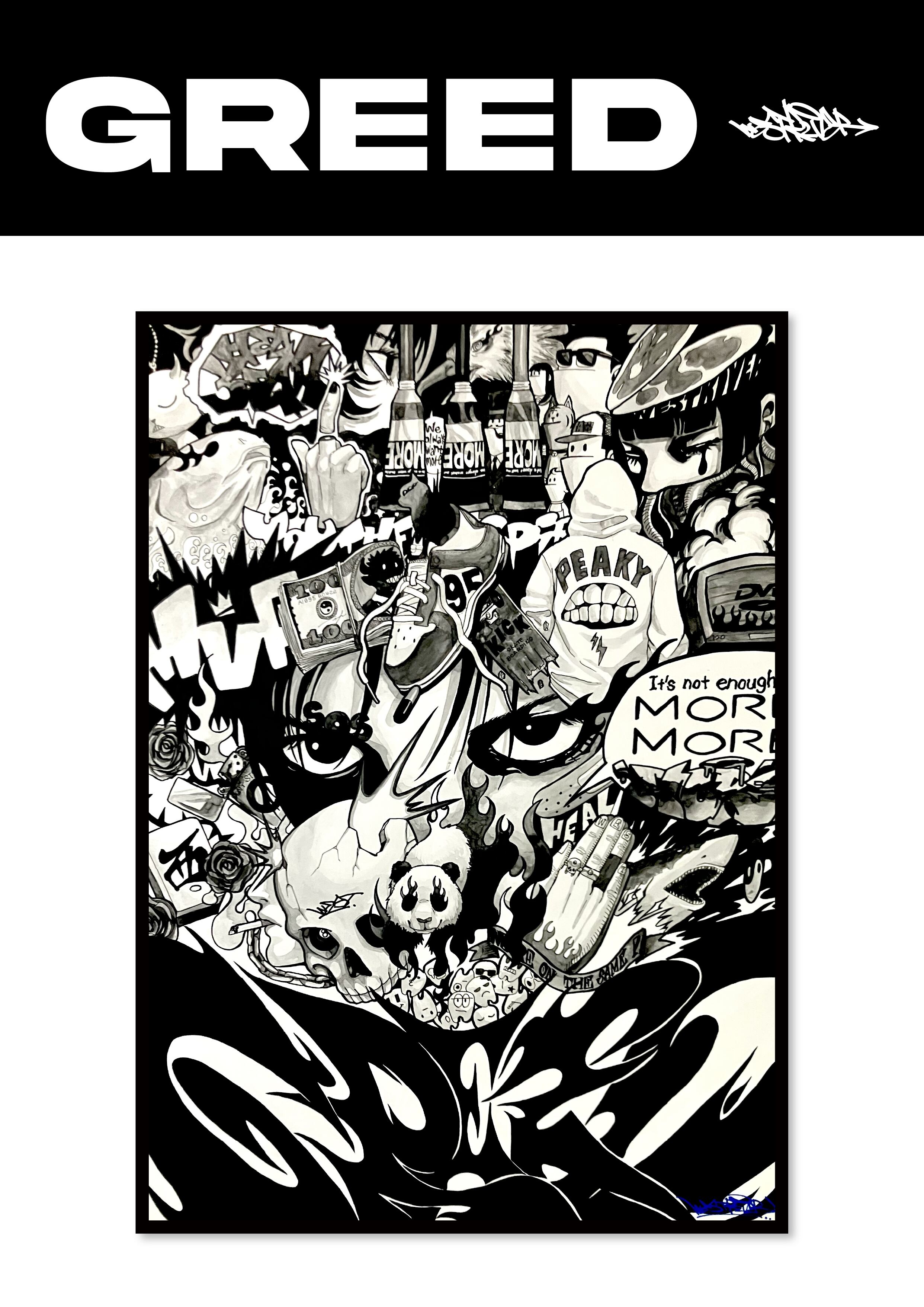 墨で描いたA2サイズの作品です。自身の物欲や強欲さを表した作品でタイトルをGREEDとしました。